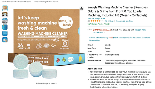 amoyls Washing Machine Cleaner | Removes Odors & Grime from Front & Top Loader Machines, including HE (Ocean - 24 Tablets)