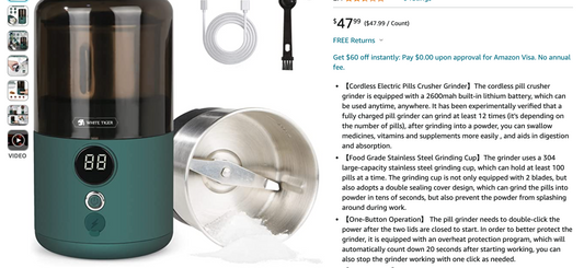 55% off Electric Pill Crusher Grinder, White Tiger Cordless Pulverizer, Grind and Pulverize Pills to Fine Powder for Feeding, Kids or Pets - Food Grade Removable Stainless Steel Grinding Cup with Brush, Spoon