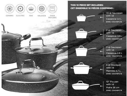 Cookware 10 pc set 1. 5 qt Saucepan 2 qt Saucepan 3 qt Saucepan 5 qt Stockpot and 10" Frypan all with glass lids and Bakelite handles