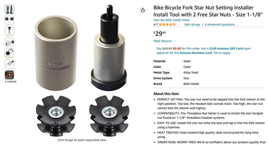 Bike Bicycle Fork Star Nut Setting Installer Install Tool with 2 Free Star Nuts - Size 1-1/8”