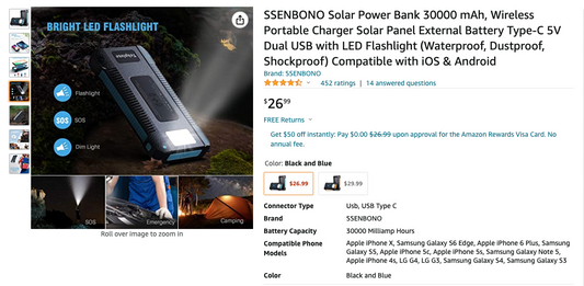 SSENBONO Solar Power Bank 30000 mAh, Wireless Portable Charger Solar Panel External Battery Type-C 5V Dual USB with LED Flashlight (Waterproof, Dustproof, Shockproof) Compatible with iOS & Android