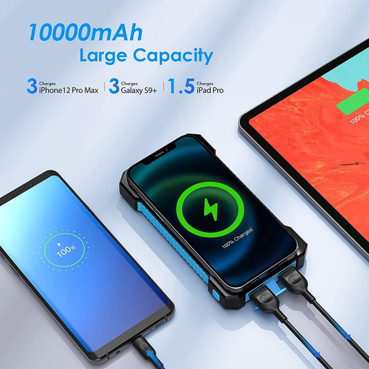 SSENBONO Solar Power Bank 10000 mAh, Wireless Portable Charger Solar Panel External Battery Type-C 5V Dual USB with LED Flashlight (Waterproof, Dustproof, Shockproof) Compatible with iOS & Android