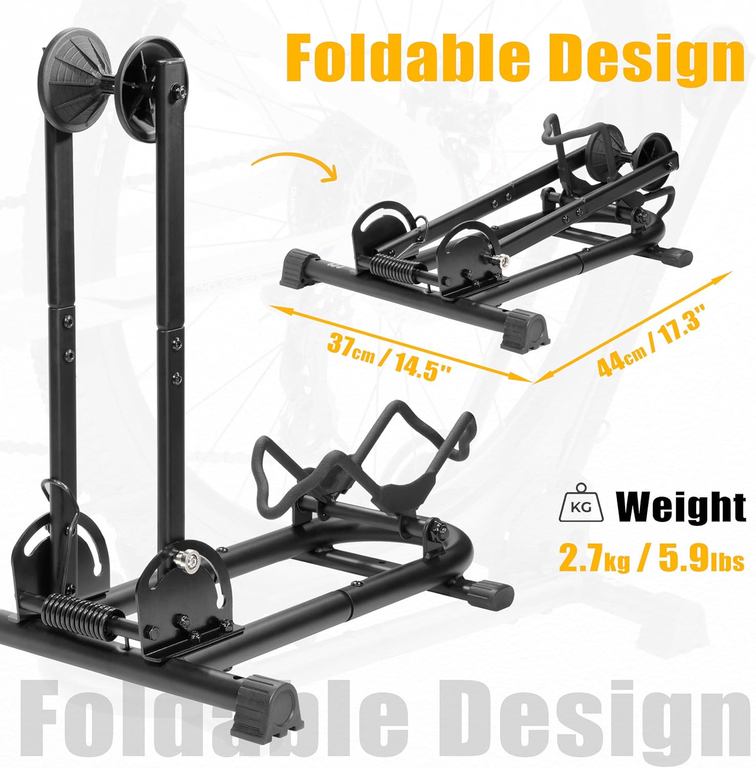 - SUPERB DURABLE QUALITY & STUNNING FINISH – Made from heat-treated, high-quality steel with a sleek powder-coated finish, this bike stand for garage is built to last when used properly. FITS NEARLY ALL BIKES – Designed for versatility, this bike stand floor storage rack accommodates a wide range of bikes, including kids' bikes, 26" to 29" mountain bikes, and 650c to 700c road bikes, with a maximum tire width of 2.4".