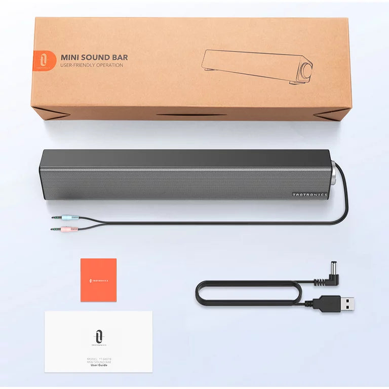 TaoTronics PC Sound Bar Wired Computer Speaker, Works with any device that has a standard 3.5mm headphone jack, such as PCs/ laptops / smartphones / tablets / projectors. TaoTronics sound bar's long, slender cabinet contains two or more speakers and may provide either stereo or surround sound. It can deliver high-quality TV sound without requiring space. It will simplify your home audio system enormously. Precision engineering. Soundbars produce much richer and more nuanced sound than any single speaker is capable of replicating.